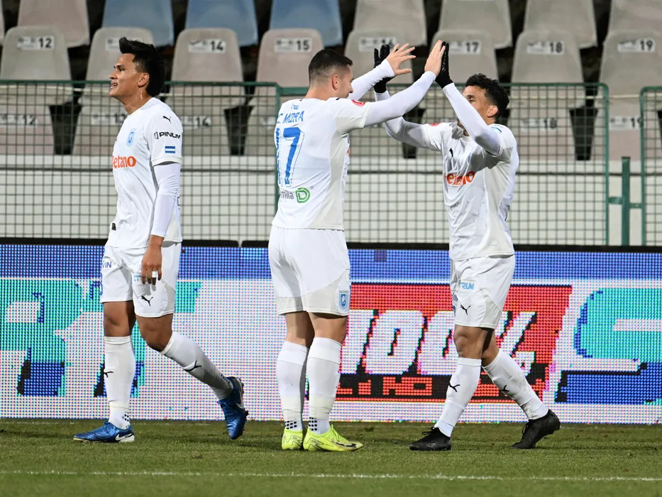 Bucurie a fotbaliștilor craioveni Manguia Denil Omar Maldonado, Carlos Andrei Mora Montoya si Luis Javier Paradela Diaz după un gol marcat in meciul de fotbal dintre Gloria Buzau si Universitatea Craiova, contand pentru Superliga Superbet, desfasurat pe Stadionul Municipal din Buzau, sambata 21 decembrie 2024. © FOTO:Razvan Pasarica/SPORT PICTURES
