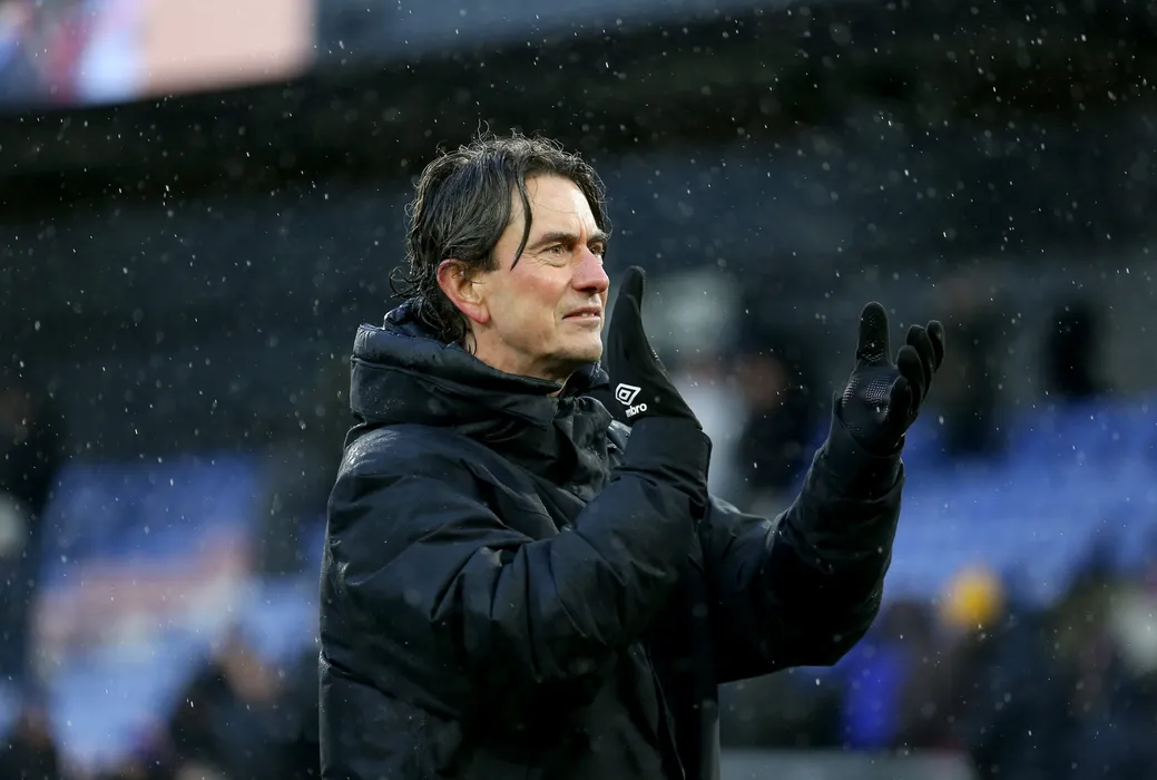 26 January 2025, United Kingdom, London: Brentford manager Thomas Frank acknowledges the crowd at the final whistle after the English Premier League soccer match between Crystal Palace and Brentford at Selhurst Park. Photo: Nigel French/PA Wire/dpa
