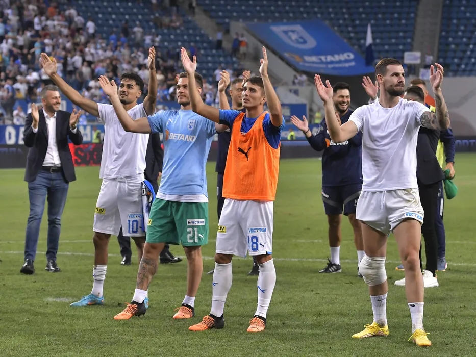 Fotbalistii craioveni Stefan Baiaram, Iulian Laurentiu Popescu, Stefan Marinel Vladoiu si Elvir Koljic saluta galeria dupa meciul de fotbal dintre Universitatea Craiova si FC Zorya Luhansk, din cadrul UEFA Europa Conference League, desfasurat pe Stadionul Ion Oblemenco din Craiova, joi 11 august 2022. © FOTO:Razvan Pasarica/SPORT PICTURES