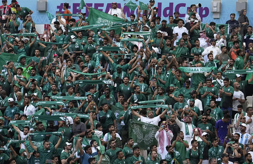 Saudi Arabia's fans during the World Cup group C soccer match between Argentina and Saudi Arabia at the Lusail Stadium in Lusail, Qatar, Tuesday, Nov. 22, 2022. (AP Photo/Ebrahim Noroozi)