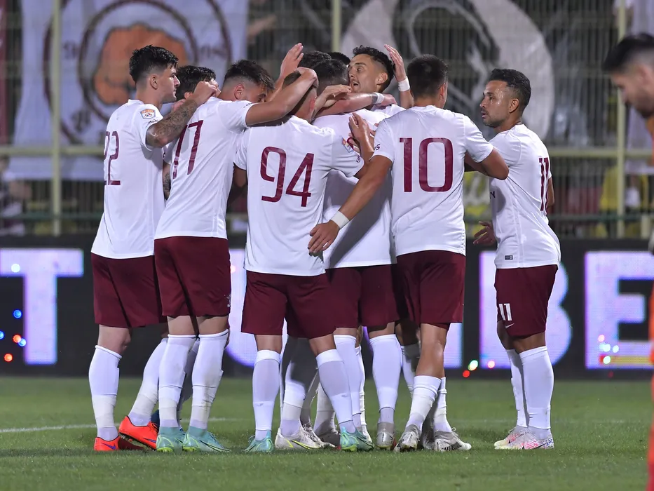 Bucurie a fotbalistilor rapidisti dupa un gol marcat cu Cristian Ionut Sapunaru, Claudiu Belu Iordache, Nicolae Carnat si Morais Junior Iraneuton Sousa in meciul de fotbal dintre CS Mioveni si Rapid Bucuresti, contand pentru Liga 1 Casa Pariurilor, desfasurat pe Stadionul Orasenesc din Mioveni, sambata 23 iulie 2021. © FOTO:Razvan Pasarica/SPORT PICTURES