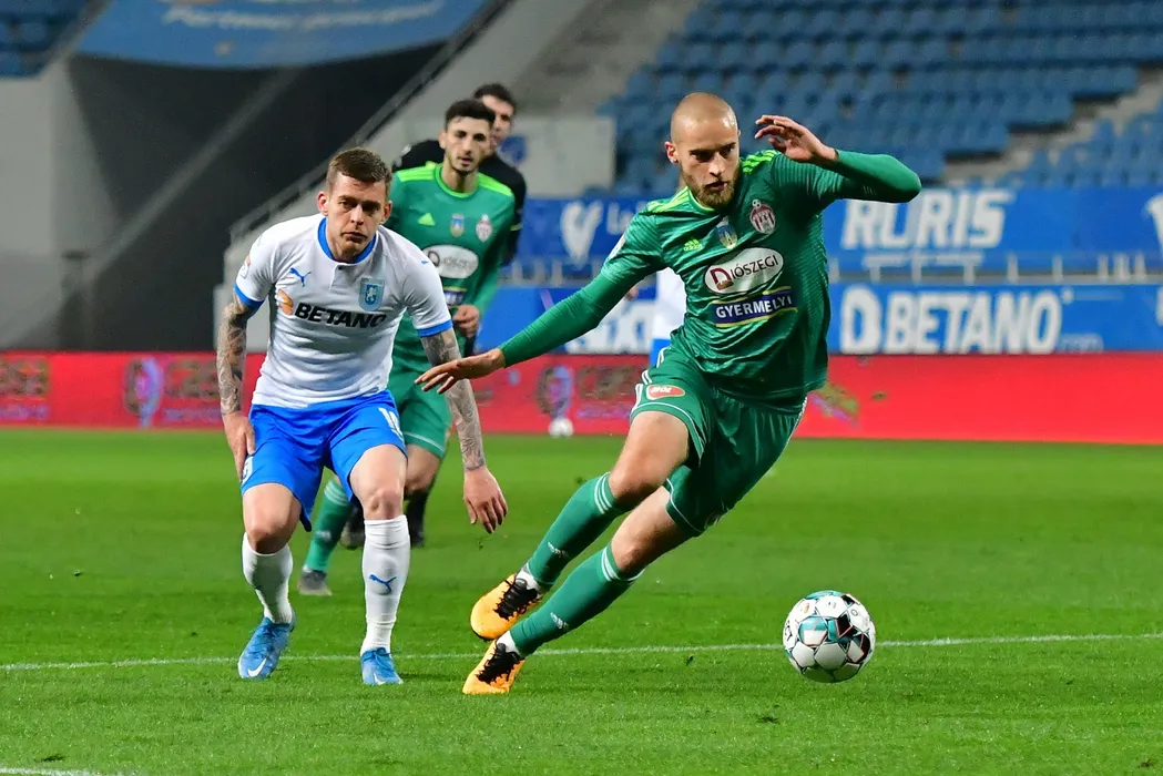 Alexandru Cicaldau (S), de la Universitatea Craiova, lupta pentru balon cu Pavol Safranko (D), de la Sepsi OSK, in meciul de fotbal din prima etapa a play-off-ului Ligii 1, disputat pe stadionul Ion Oblemenco din Craiova, sambata, 17 aprilie 2021. REMUS BADEA / MEDIAFAX FOTO