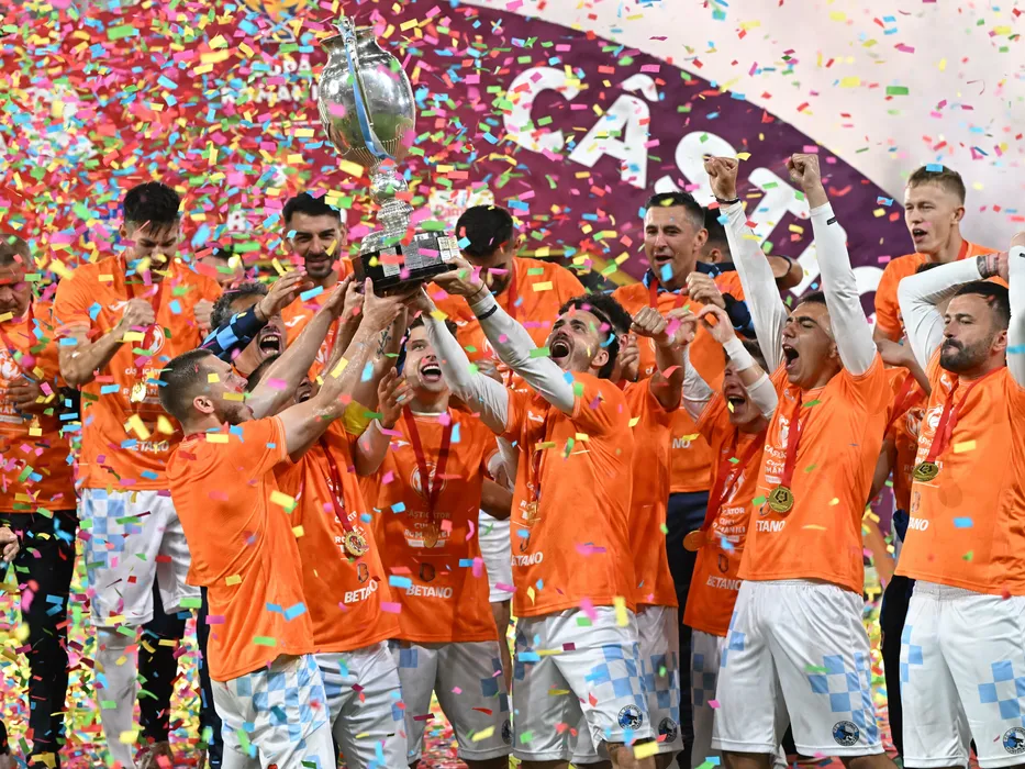 Fotbalistii hunedoreni printre care Alexandru Neacsa, Marius Chindris si Andrei Herghelegiu se bucura dupa castigarea Cupei Romaniei Betano in urma meciului impotriva celor de la Otelul Galati, desfasurat pe Stadionul Municipal din Sibiu, miercuri 15 mai 2024. © FOTO:Razvan Pasarica/SPORT PICTURES