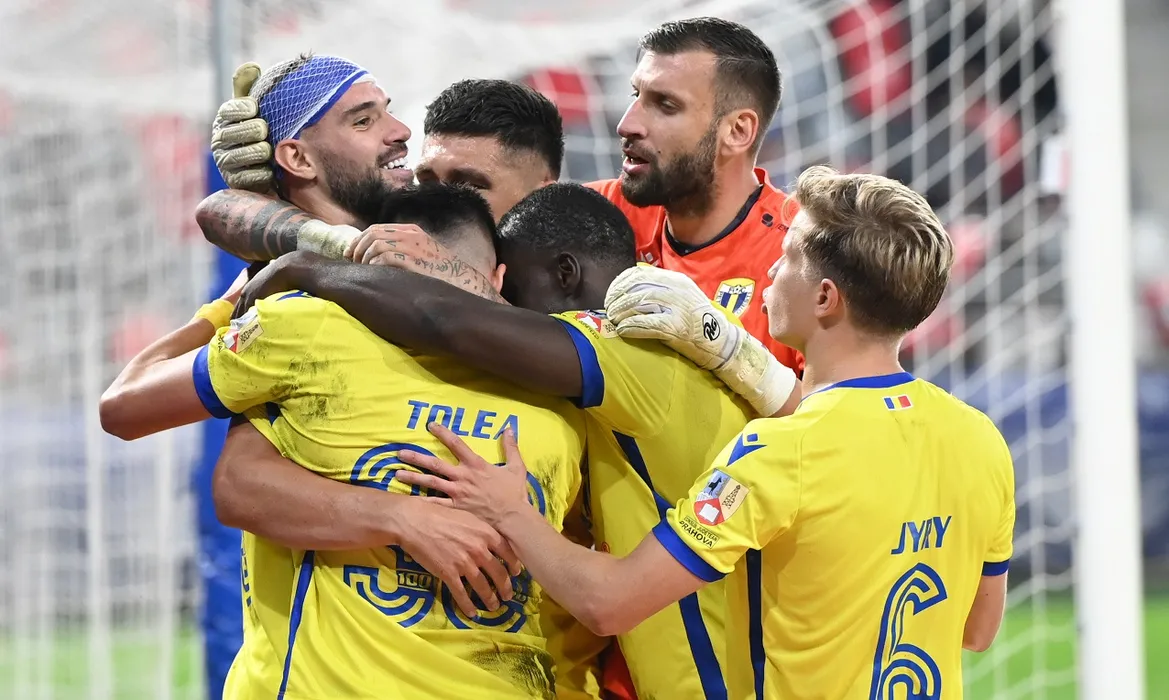 Bucurie a fotbaliștilor ploieșteni Alexandru Tudorie, Lukas Zima si Tommi Matti Jyry după un gol marcat in meciul de fotbal dintre FCSB si Petrolul Ploiesti, contand pentru Superliga Superbet, desfasurat pe Stadionul Steaua-Ghencea din Bucuresti, sambata 21 septembrie 2024. © FOTO:Razvan Pasarica/SPORT PICTURES