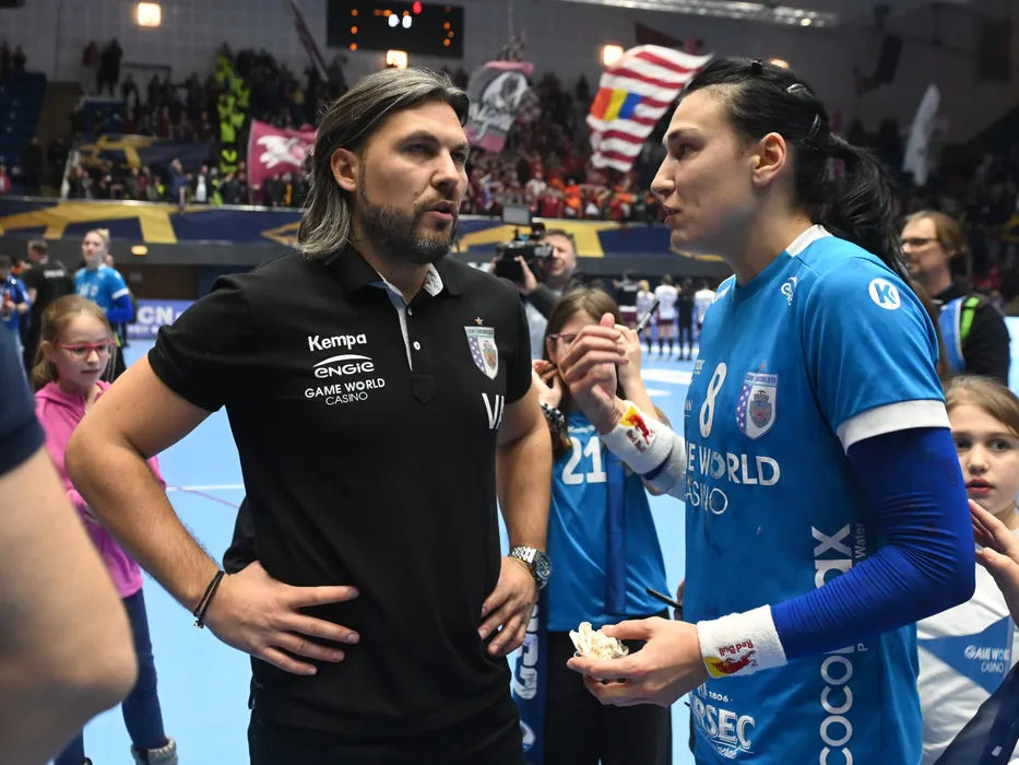 Adrian Vasile discuta cu Cristina Georgiana Neagu dupa meciul de handbal feminin dintre CSM Bucuresti si Rapid Bucuresti, contand pentru Liga Florilor, desfasurat in Sala Polivalenta-Ioan Kunst Ghermanescu din Bucuresti, luni 30 ianuarie 2023. © FOTO:Razvan Pasarica/SPORT PICTURES
