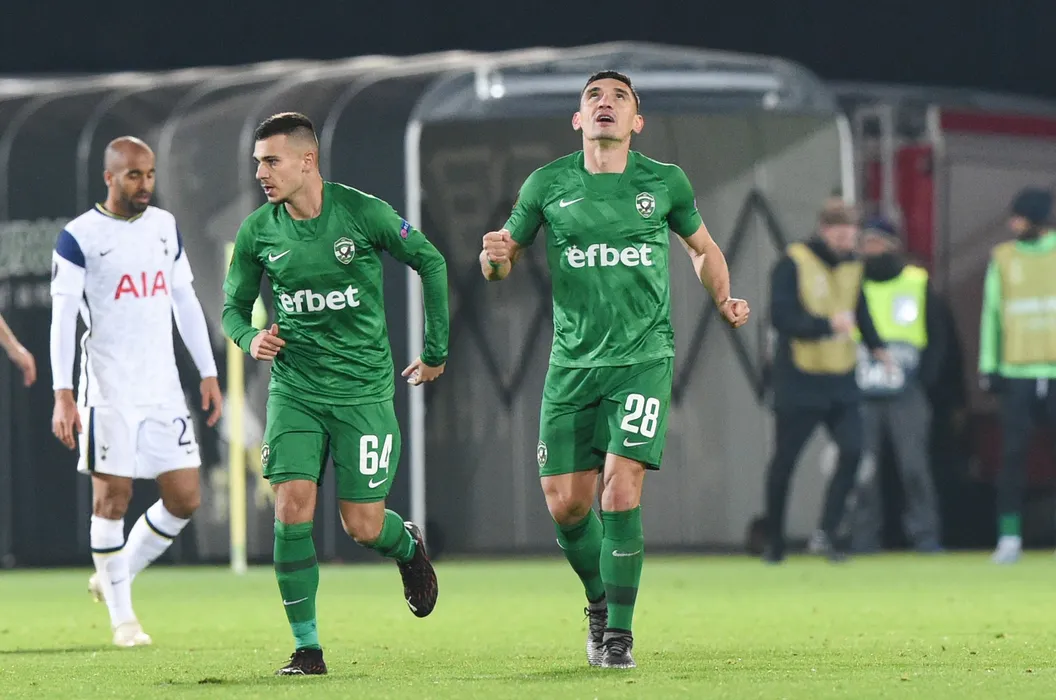 Ludogorets Razgrad's Romanian forward Claudiu-Andrei Keseru celebrates after scoring during the UEFA Europe League group stage football match between Ludogorets Razgrad and Tottenham Hotspur in Razgrad on November 5, 2020.,Image: 567604042, License: Rights-managed, Restrictions: , Model Release: no