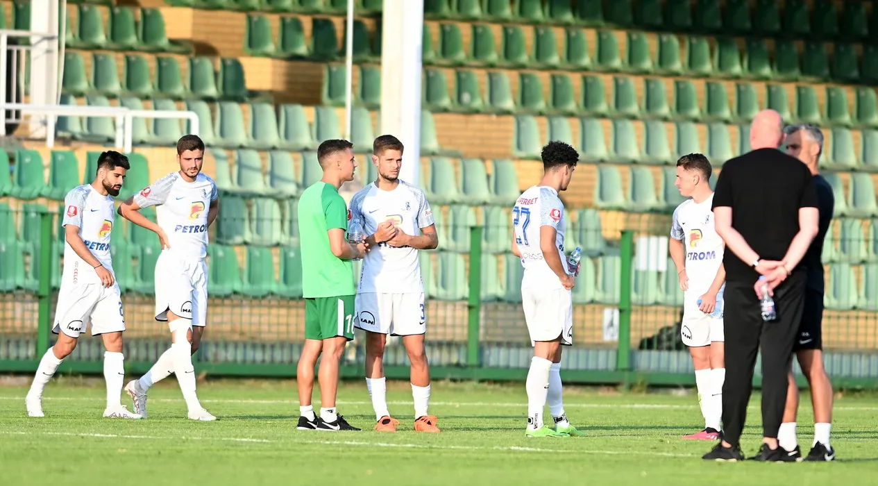 Fotbalistii constanteni Ionut Vina, Dragos Ionut Nedelcu, Mihai Queiros si Marco Borgnino discuta dupa meciul amical de fotbal dintre Warta Poznan si Farul Constanta, desfasurat pe Stadionul Warty (Ogrodek) din Poznan, Polonia, duminica 2 iulie 2023. © FOTO:Razvan Pasarica/SPORT PICTURES