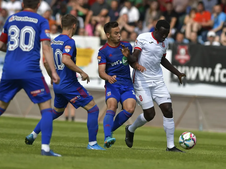 Iustin Raducan si Baba Alhassan in meciul de fotbal dintre FC Hermannstadt si Steaua Bucuresti, contand pentru Play-off-ul Ligii a-2-a Casa Pariurilor, desfasurat pe Stadionul Municipal din Medias, duminica 15 mai 2022. © FOTO:Razvan Pasarica/SPORT PICTURES
