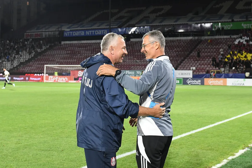 Cei doi antrenori Dan Vasile Petrescu și Ovidiu Ioan Sabău se salută înaintea meciului de fotbal dintre FC CFR 1907 Cluj si FC Universitatea Cluj, contând pentru Superliga Superbet, desfășurat pe Stadionul Dr.Constantin Rădulescu din Cluj-Napoca, duminică 4 august 2024. © FOTO: Flaviu BUBOI/SPORT PICTURES