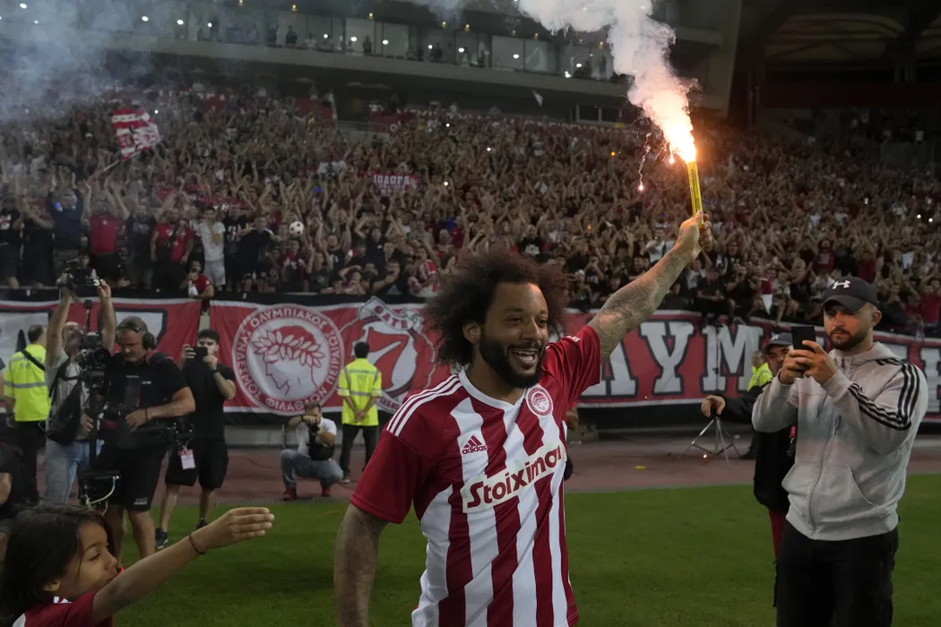 Brazilian soccer player Marcelo holds a flare during his presentation by Olympiakos at Georgios Karaiskakis stadium at Piraeus port, near Athens, Greece, Monday, Sept. 5, 2022. Greek soccer club Olympiakos signed Brazilian star Marcelo, the contract is for one year, with an option for an additional year. (AP Photo/Thanassis Stavrakis)