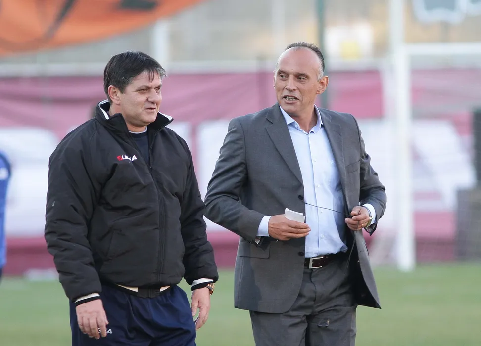 Antrenorul formatiei CSMS Iasi, Marius Lacatus (S) si Florin Prunea, inaintea meciului cu CSMS Iasi, din liga a II-a la fotbal, in Bucuresti, sambata, 15 martie 2014. GEORGE FILIP / MEDIAFAX FOTO