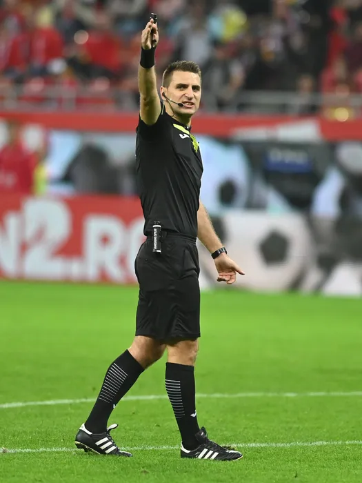Arbitrul central Rares George Vidican reactioneaza in meciul de fotbal dintre Dinamo Bucuresti si Politehnica Iasi, din cadrul Superligii Superbet, desfasurat pe Arena Nationala din Bucuresti, vineri 27 octombrie 2023. © FOTO:Razvan Pasarica/SPORT PICTURES