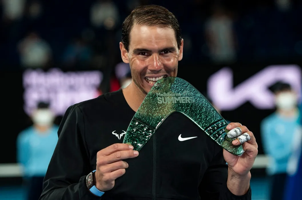 Rafael Nadal of Spain celebrates with the trophy after his victory in his men's singles match against Maxime Cressy of the United States at the Melbourne Summer Set tennis tournament in Melbourne on January 9, 2022.,Image: 651536713, License: Rights-managed, Restrictions: -- IMAGE RESTRICTED TO EDITORIAL USE - STRICTLY NO COMMERCIAL USE --, Model Release: no, Credit line: Profimedia