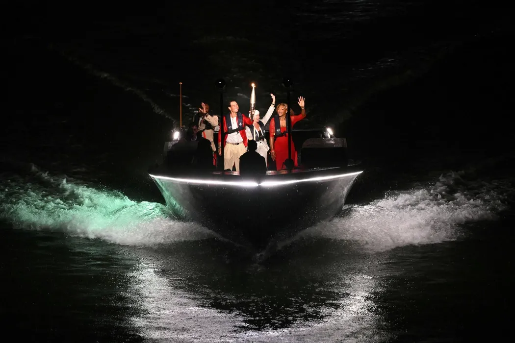 Spanish tennis player Rafael Nadal (2L) holds the Olympic torch next to US' athlete Carl Lewis (L), Romanian gymnast Nadia Comaneci (2R) and US tennis player Serena Williams (R) on the river Seine during the opening ceremony of the Paris 2024 Olympic Games in Paris on July 26, 2024.,Image: 892765914, License: Rights-managed, Restrictions: , Model Release: no