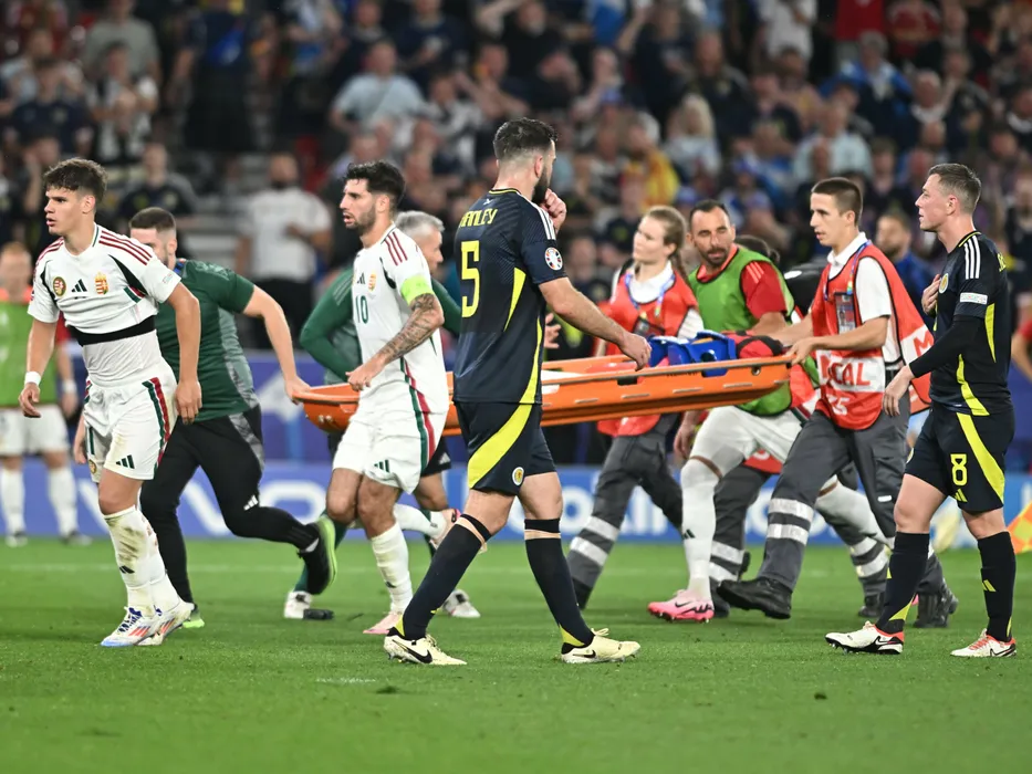 Fotbalistii maghiari Milos Kerkez si Dominik Szoboszlai grabesc venirea targii pe teren la meciul de fotbal dintre Scotia si Ungaria, contand pentru UEFA EURO 2024, desfasurat pe Stuttgart Arena din Stuttgart, duminica 23 iunie 2024. © FOTO:Razvan Pasarica/SPORT PICTURES