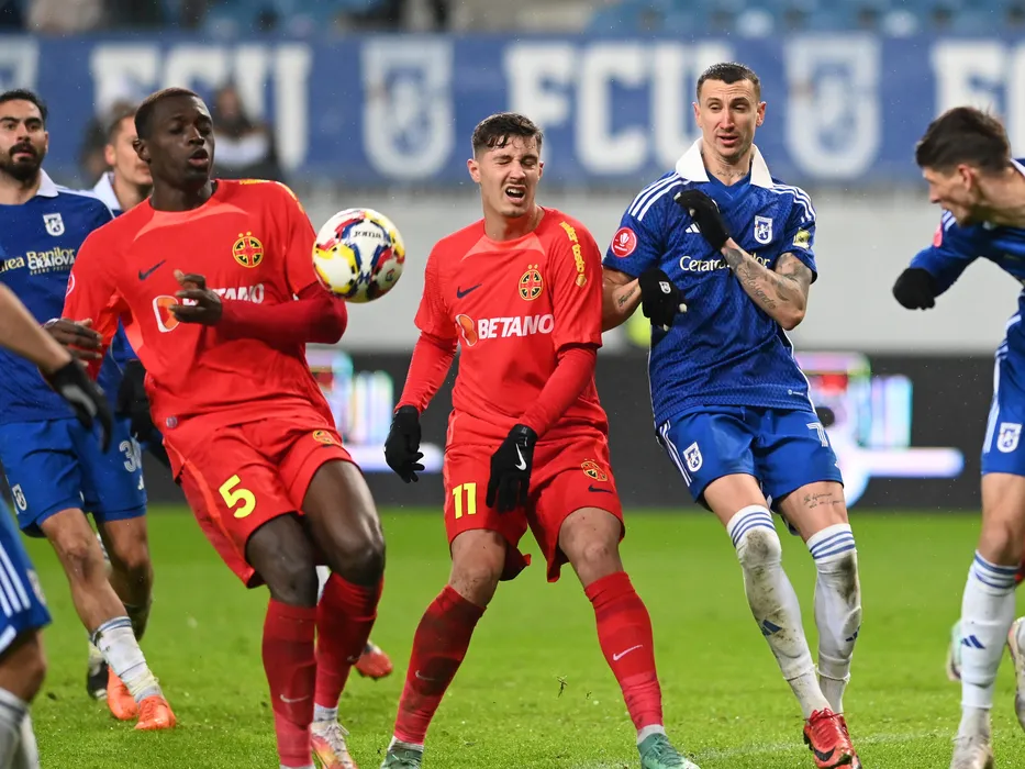 Joyskim Aurelien Dawa Tchakonte, David Raul Miculescu si Andrea Padula in meciul de fotbal dintre FC U Craiova si FCSB, contand pentru Cupa Romaniei Betano, desfasurat pe Stadionul Ion Oblemenco din Craiova, joi 7 decembrie 2023. © FOTO:Razvan Pasarica/SPORT PICTURES