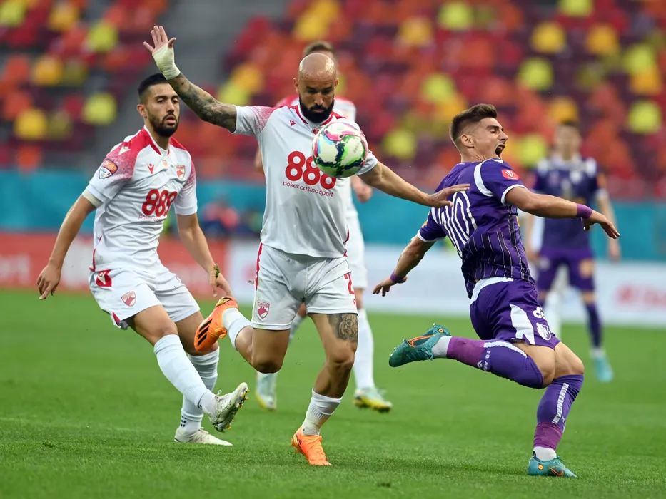 Daniel Gago Iglesias, Gabriel Rodrigues De Moura si Andrias Cristian Calcan in meciul de fotbal dintre Dinamo Bucuresti si FC Arges, contand pentru mansa tur a barajului de promovare in Superliga Superbet, desfasurat pe Arena Nationala din Bucuresti, luni 29 mai 2023. © FOTO:Razvan Pasarica/SPORT PICTURES