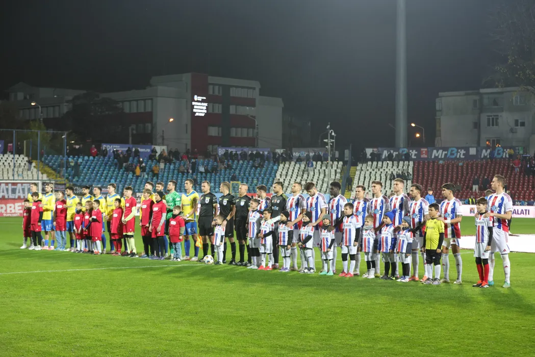 Fotbalistii celor doua echipe alaturi de brigada de arbitrii la startul meciului dintre Otelul Galati si Farul Constanta, contand pentru Superliga Superbet, desfasurat pe Stadionul Otelul din Galati, duminica 23 noiembrie 2025. © FOTO:Sorin Pana/SPORT PICTURES
