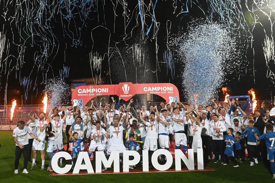 Bucurie a fotbalistilor constanteni dupa castigarea campionatului dupa meciul de fotbal dintre Farul Constanta si FCSB, contand pentru Play-off-ul Superligii Superbet, desfasurat pe Stadionul central al Academiei Gheorghe Hagi din Ovidiu, duminica 21 mai 2023. © FOTO:Razvan Pasarica/SPORT PICTURES