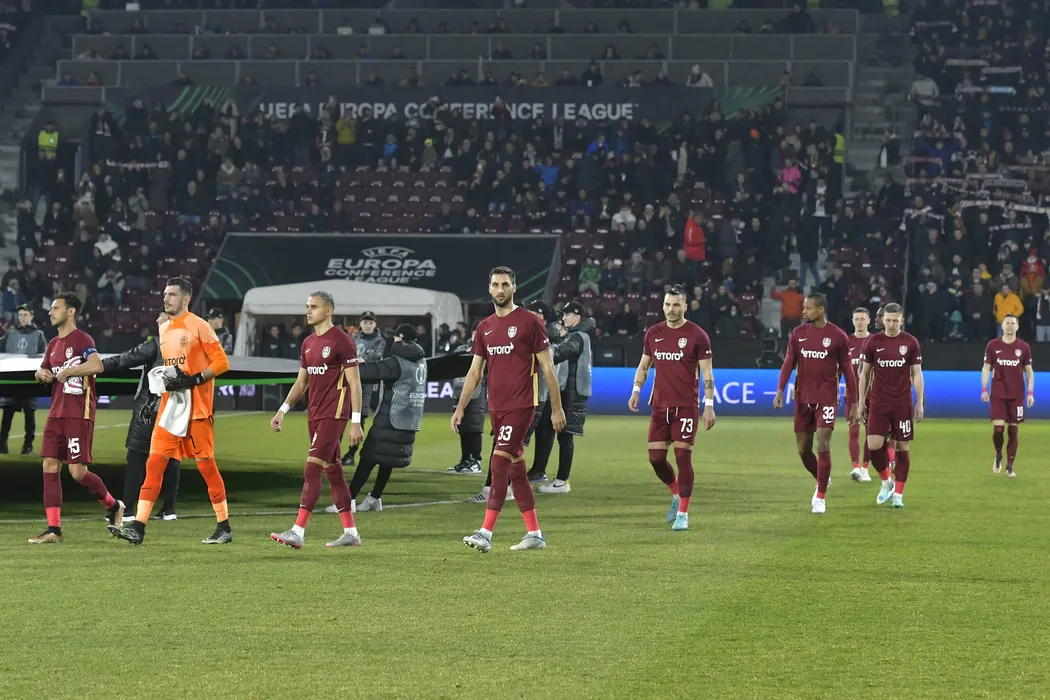 Fotbalistii clujeni la startul meciului de fotbal dintre CFR Cluj si SS Lazio, din cadrul UEFA Europa Conference League, desfasurat pe Stadionul Dr. Constantin Radulescu din Cluj Napoca, joi 23 februarie 2023. © FOTO:Razvan Pasarica/SPORT PICTURES