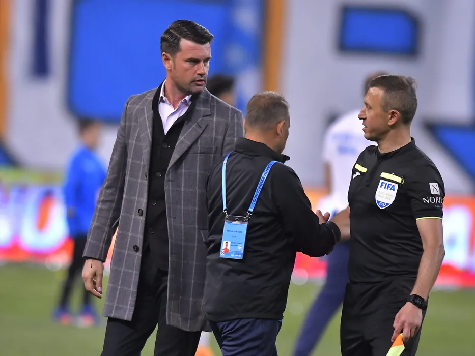 Marian Copilu discuta cu arbitrul asistent Ovidiu Artene dupa meciul de fotbal dintre Universitatea Craiova si FCSB, contand pentru Play-off-ul Ligii 1 Casa Pariurilor, desfasurat pe Stadionul Ion Oblemenco din Craiova, duminica 8 mai 2022. © FOTO:Razvan Pasarica/SPORT PICTURES