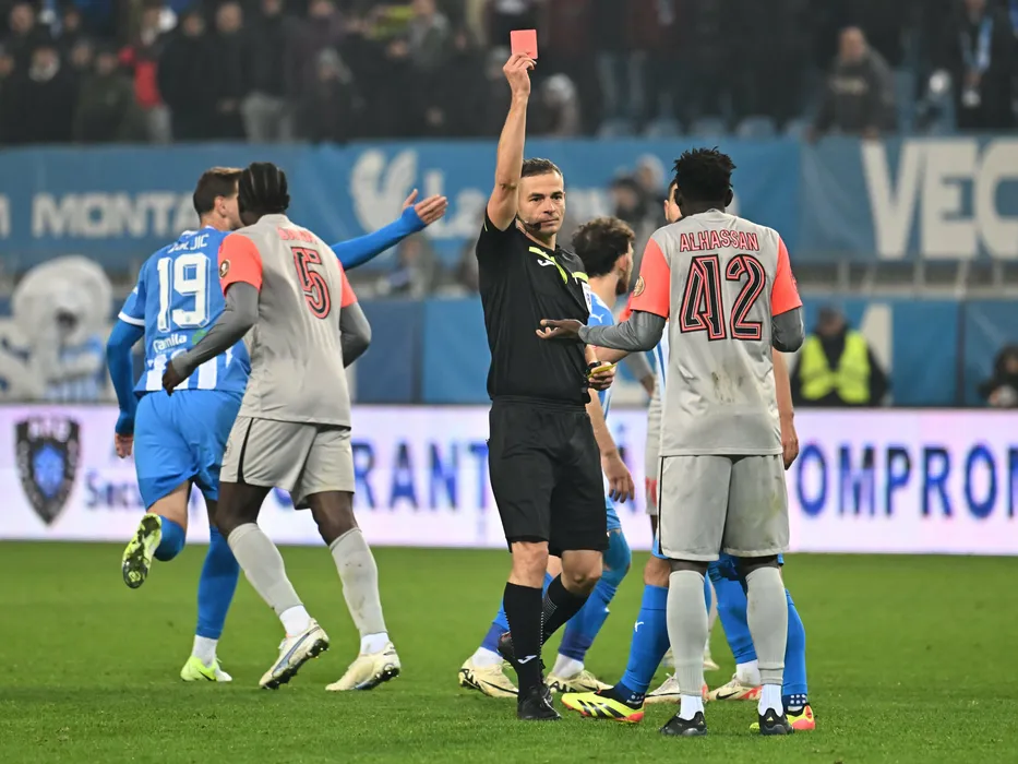 Arbitrul central Florin Andrei acordă un cartonaș roșu lui Baba Alhassan in meciul dintre Universitatea Craiova si FCSB, contand pentru Superliga Superbet, desfasurat pe Stadionul Ion Oblemenco din Craiova, duminica 3 noiembrie 2024. © FOTO:Razvan Pasarica/SPORT PICTURES