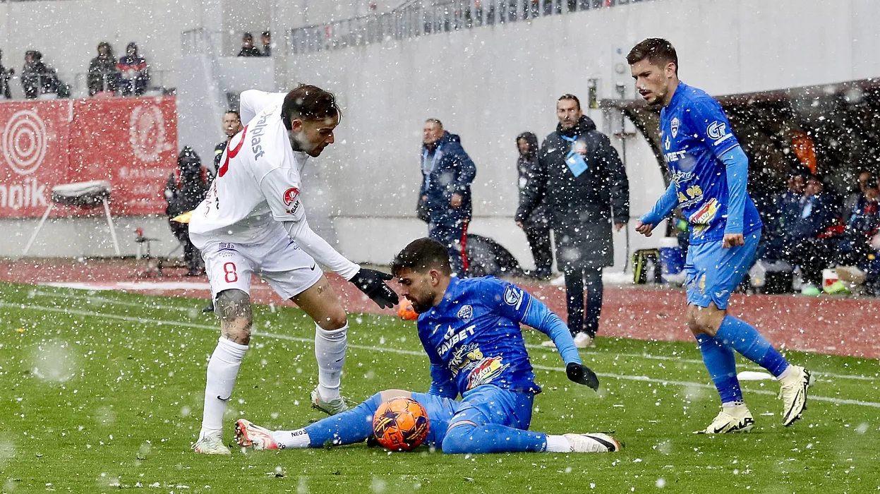 Alesssandro Murgia si Pineda Israel Puerto, Alessandro Ciranni in meciul de fotbal dintre AFC Hermannstadt Sibiu si Gloria Buzau, contand petru Superliga Superbet - Play-Out, desfasurat pe Stadionul Municipal din Sibiu, duminica 6 aprilie 2025. © FOTO: Valentin Macrea/SPORT PICTURES
