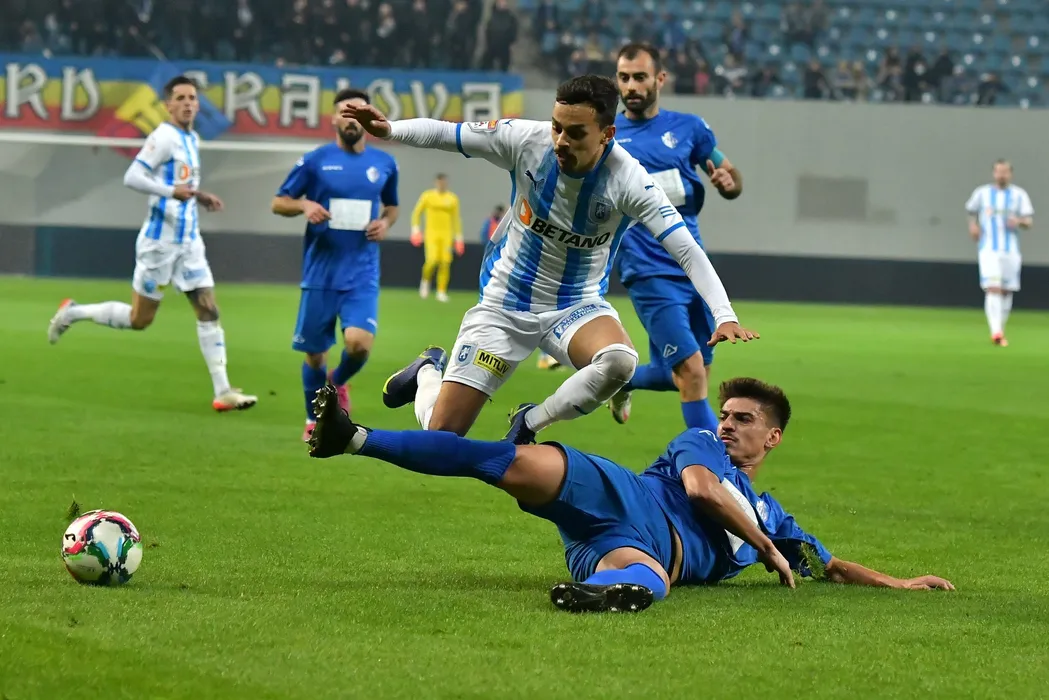 Lyes Houri (C) in meciul de fotbal Universitatea Craiova -( echipament alb albastru ) - ACSO Filiasi ( echipament albastru ) din Cupa Romaniei sferturile de finala disputat pe stadionul Ion Oblemenco din Craiova joi 02 decembrie 2021 . REMUS BADEA / MEDIAFAX FOTO
