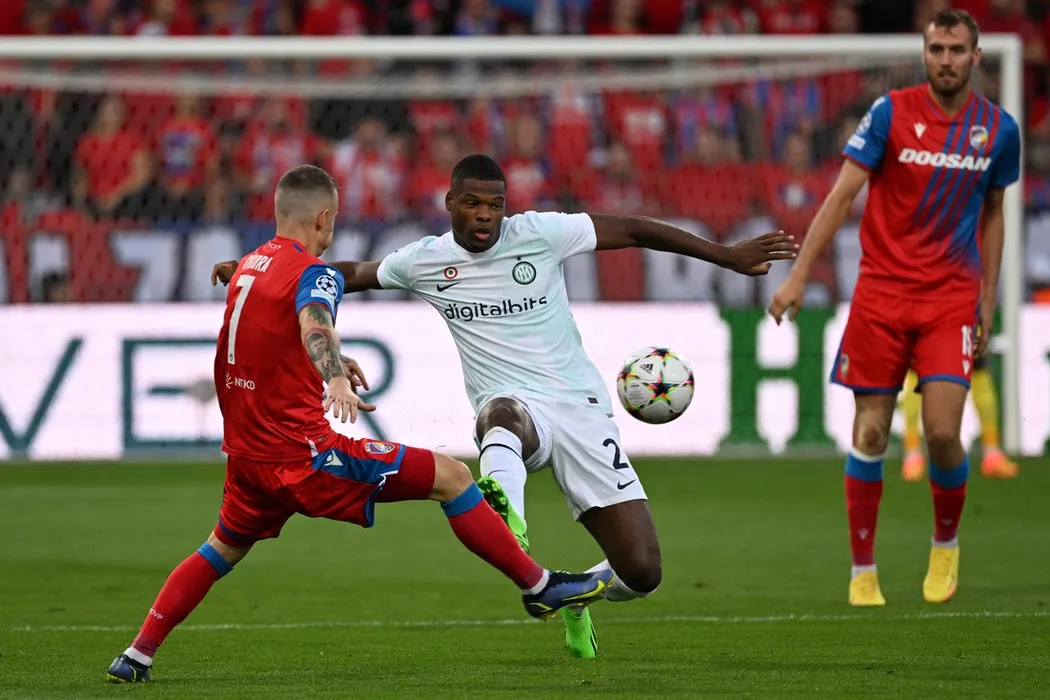 Viktoria Plzeň - Inter Milán, utkání 2. kola skupiny C fotbalové Ligy mistrů, 13. září 2022, Plzeň. Zleva Jan Sýkora z Plzně, Denzel Dumfries z Interu a Tomáš Chorý z Plzně.,Image: 722376465, License: Rights-managed, Restrictions: AUDIO, Model Release: no