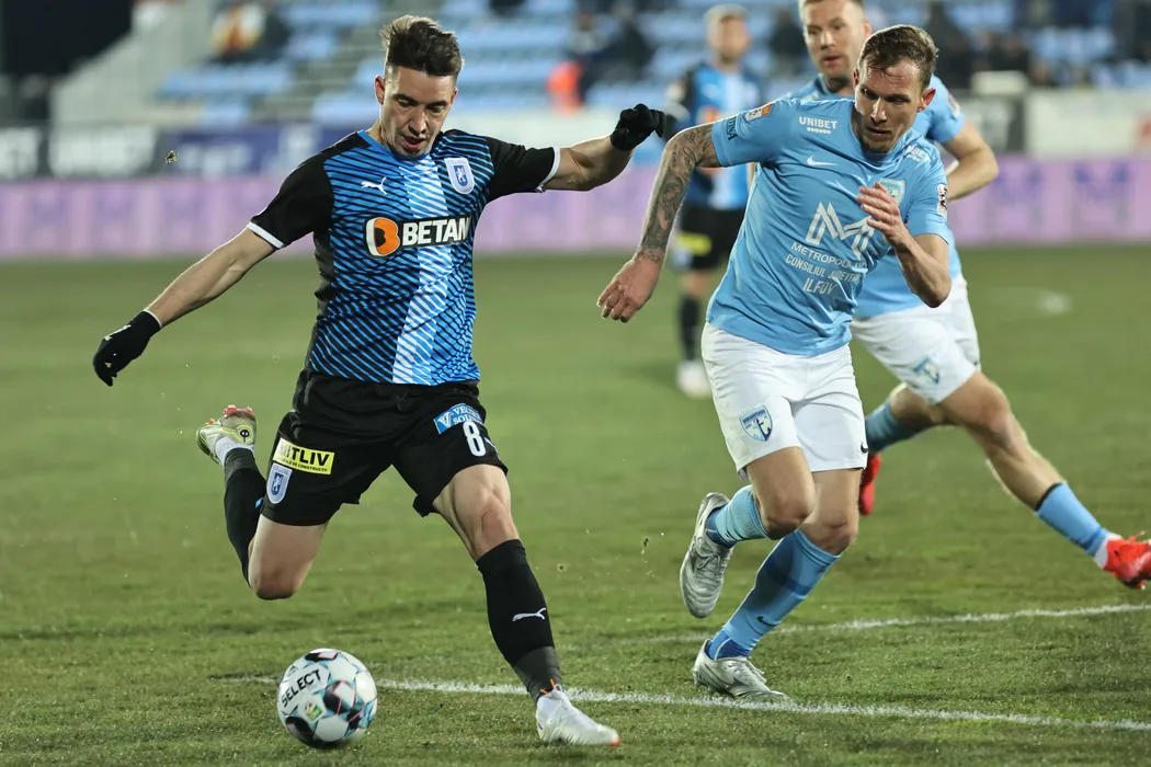 Alexandru Mateiu degajeaza in timpul partidei dintre FC Voluntari (echipament alb-bleu) si Universitatea Craiova, partida disputata in etapa a doua din play-off-ul Ligii 1 de fotbal, vineri, 18 martie 2022, in Voluntari, Ilfov. GEORGE FLUSTER / MEDIAFAX FOTO