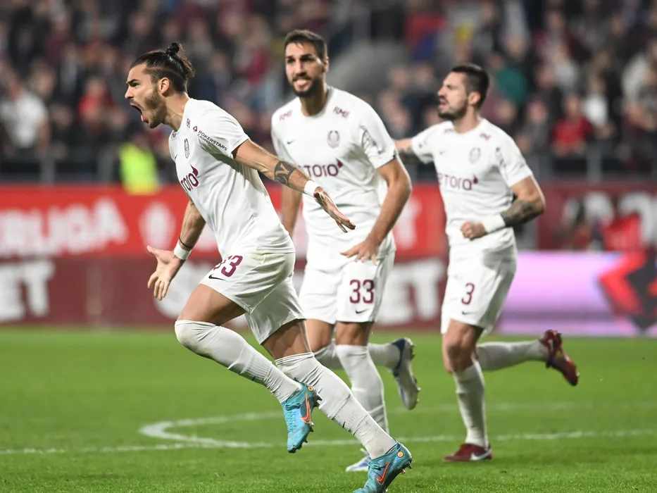 Bucurie a fotbalistilor clujeni dupa un gol marcat cu Andonie Andrei Burca, Denis Kolinger si Karlo Muhar in meciul de fotbal dintre Rapid Bucuresti si CFR Cluj, contand pentru Superliga Superbet, desfasurat pe Stadionul Rapid Giulesti din Bucuresti, duminica 30 octombrie 2022. © FOTO:Razvan Pasarica/SPORT PICTURES