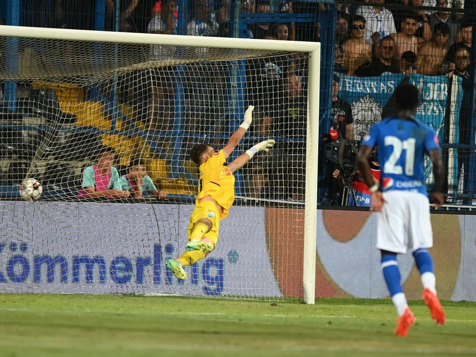 Louis Munteanu marcheaza un gol in poarta lui Iulian Laurentiu Popescu in meciul de fotbal dintre Farul Constanta si Universitatea Craiova, contand pentru Superliga Superbet, desfasurat pe Stadionul central al Academiei Gheorghe Hagi din Ovidiu, duminica 27 august 2023. © FOTO:Razvan Pasarica/SPORT PICTURES