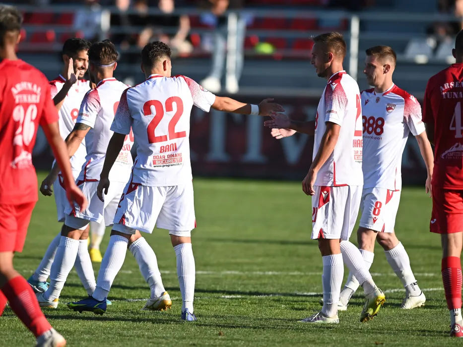 Bucurie a fotbalistilor dinamovisti dupa un gol marcat cu Ahmed Mustafa Bani, Vasile Buhaescu si Valentin Marius Lazar in meciul de fotbal dintre CS Tunari si Dinamo Bucuresti, contand pentru Cupa Romaniei, desfasurat pe Stadionul Arsenal din Tunari, miercuri 14 septembrie 2022. © FOTO:Razvan Pasarica/SPORT PICTURES