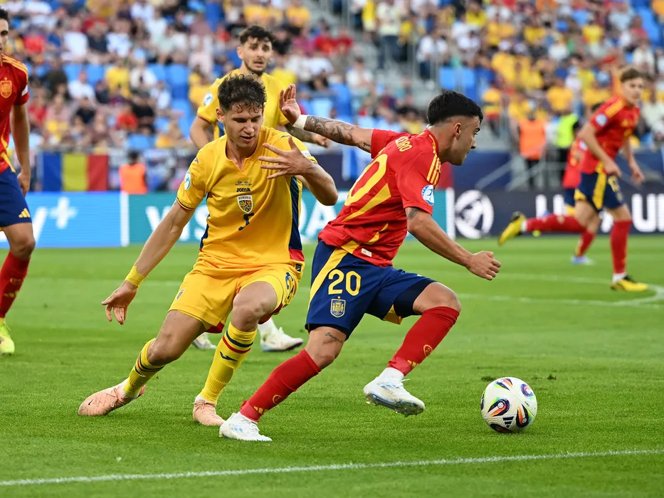 Matei Ilie si Alberto Moleiro in meciul de fotbal dintre Spania U21 si Romania U21, din cadrul UEFA EURO U21 din Slovacia, desfasurat pe Stadionul National de fotbal din Bratislava, sambata 14 iunie 2025. © FOTO:Razvan Pasarica/SPORT PICTURES