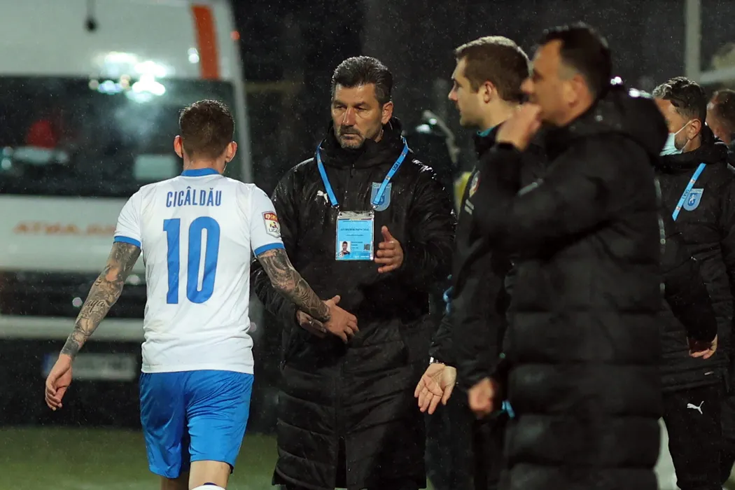 Alexandru Cicaldau (S) si Marinos Ouzounidis (C), antrenorul echipei Universitatea Craiova, isi dau mana in timpul meciului de fotbal contra formatiei FCSB din etapa 29 a Ligii 1, disputat pe stadionul Marin Anastasovici din Giurgiu, duminica, 4 aprilie 2021. GEORGE FILIP / MEDIAFAX FOTO