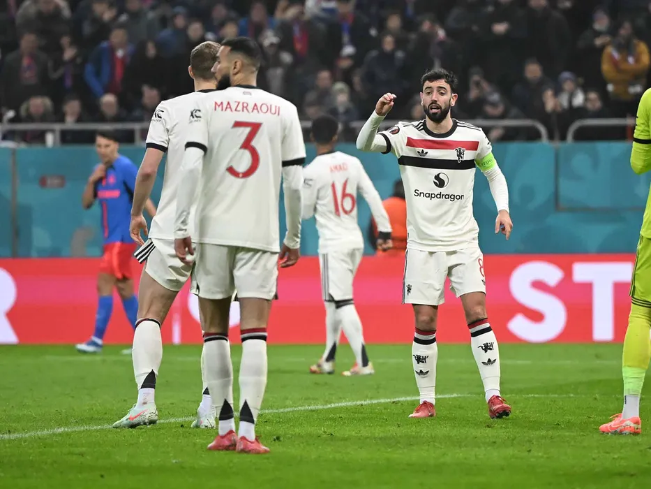 Bruno Fernandes reacționează in meciul de fotbal dintre FCSB si Manchester United, din cadrul UEFA Europa League, desfasurat pe Arena Nationala din Bucuresti, joi 30 ianuarie 2025. © FOTO:Razvan Pasarica/SPORT PICTURES