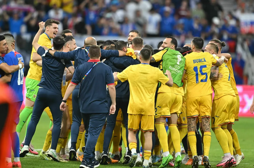 Fotbalistii romani printre care Ştefan Târnovanu si Vasile Mogoș se bucura intr-o hora pentru calificarea de pe primul loc in grupa dupa meciul de fotbal dintre Slovacia si Romania, contand pentru UEFA EURO 2024, desfasurat pe Frankfurt Arena din Frankfurt, miercuri 26 iunie 2024. © FOTO:Razvan Pasarica/SPORT PICTURES