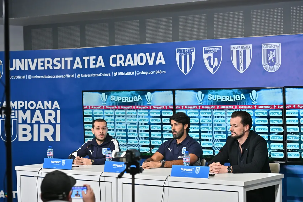 Filipe Coelho si Mario Felgueiras participa la o conferinta de presa, desfasurata in Sala de Conferinte "Sebastian Domozina" de la Stadionul "Ion Oblemenco" din Craiova, luni 10 noiembrie 2025. © FOTO:Remus Badea/SPORT PICTURES