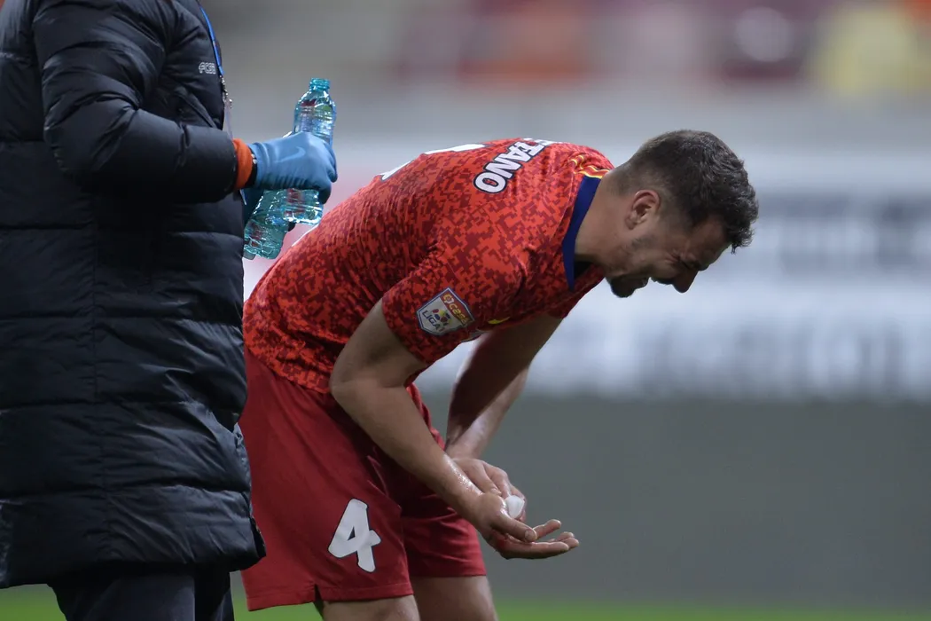 George Miron (D), de la FCSB, reactioneaza dupa ce s-a accidentat in timpul meciului de fotbal contra echipei Gaz Metan Medias din etapa a XXVI-a a Ligii 1, disputat pe Arena Nationala din Bucuresti, duminica, 7 martie 2021. ALEXANDRU DOBRE / MEDIAFAX FOTO