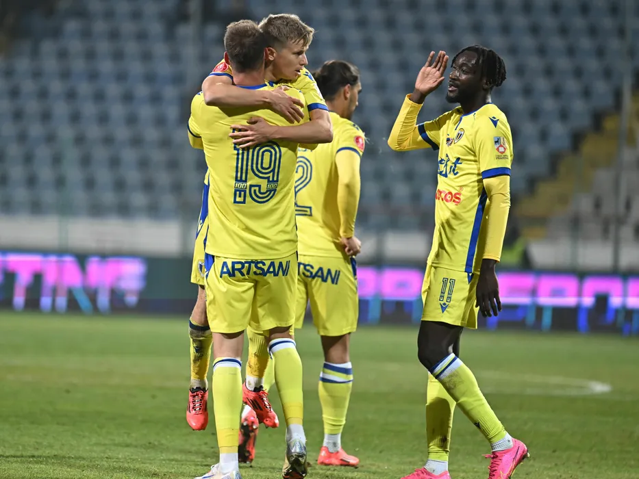 Alexandru Tudorie ii multumeste lui Tommi Matti Jyry pentru pasa de gol sub privirile lui Herman Moussaki in meciul de fotbal dintre Gloria Buzau si Petrolul Ploiesti, contand pentru Superliga Superbet, desfasurat pe Stadionul Municipal din Buzau, luni 11 noiembrie 2024. © FOTO:Razvan Pasarica/SPORT PICTURES