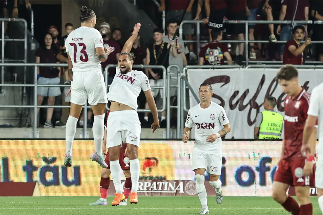 Virgiliu Postolachi se bucura dupa un gol marcat in meciul de fotbal dintre FC Rapid Bucuresti si FC CFR 1907 Cluj, contand pentru Superliga Superbet, desfasurat pe Stadionul Superbet Arena-Giulesti din Bucuresti, duminica 20 iulie 2025. © FOTO:Gheorghe Fluster/SPORT PICTURES