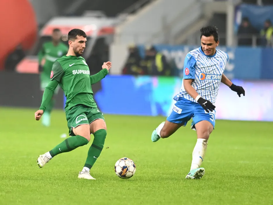 Octavian Ronaldo Andrei Deaconu si Manguia Denil Omar Maldonado în meciul de fotbal dintre Universitatea Craiova si Farul Constanta, contând pentru Superliga Superbet, desfășurat pe Stadionul Ion Oblemenco din Craiova, duminica 21 ianuarie 2024. © FOTO: Răzvan PĂSĂRICĂ/SPORT PICTURES