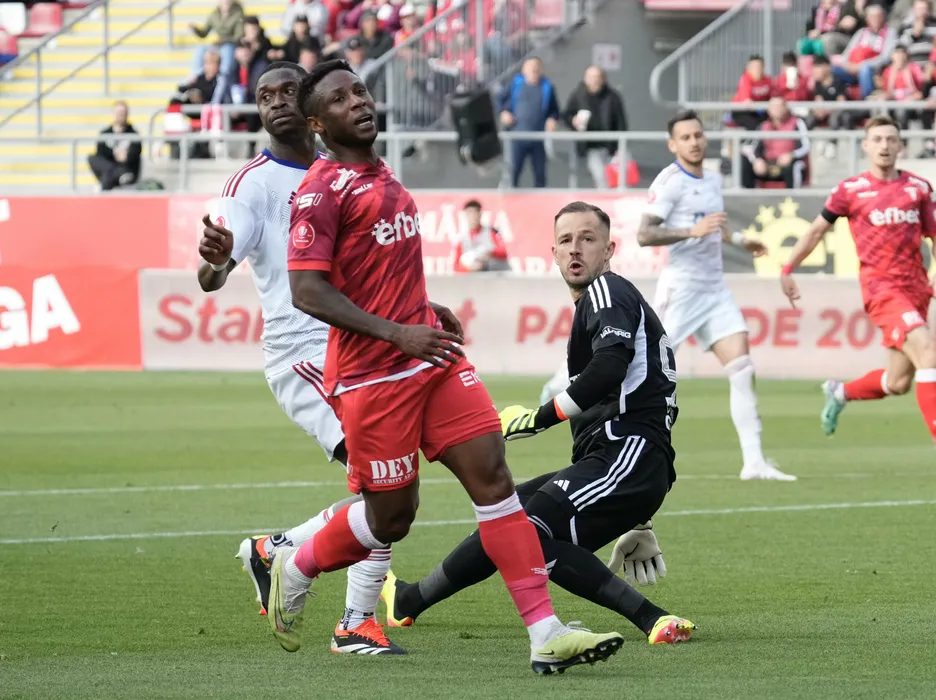 Eric Johana Omondi și Eduard Adrian Pap în meciul de fotbal dintre UTA Arad si SC Oțelul Galați, contând pentru Superliga Superbet Play-Out, desfășurat pe Arena Francisc Neuman din Arad, joi 25 aprilie 2024. © FOTO: Alexandra FECHETE/SPORT PICTURES
