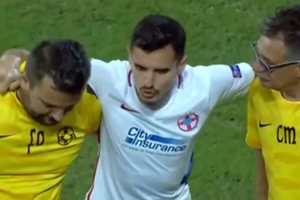 Probleme pentru FCSB! FOTO | Romario Benzar s-a accidentat și a ieșit de pe teren pe brațele oamenilor din staff-ul medical