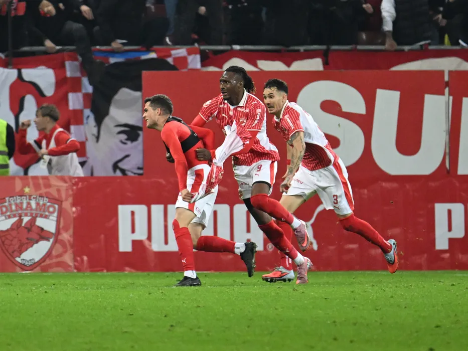 Fotbalistii dinamovisti Alberto Soro Alvarez, Mamoudou Karamoko si Raul Marian Oprut se bucura dupa un gol marcat in meciul de fotbal dintre Dinamo Bucuresti si CFR Cluj, din cadrul Superligii Superbet, desfasurat pe Arena Nationala din Bucuresti, vineri 31 octombrie 2025. © FOTO:Razvan Pasarica/SPORT PICTURES