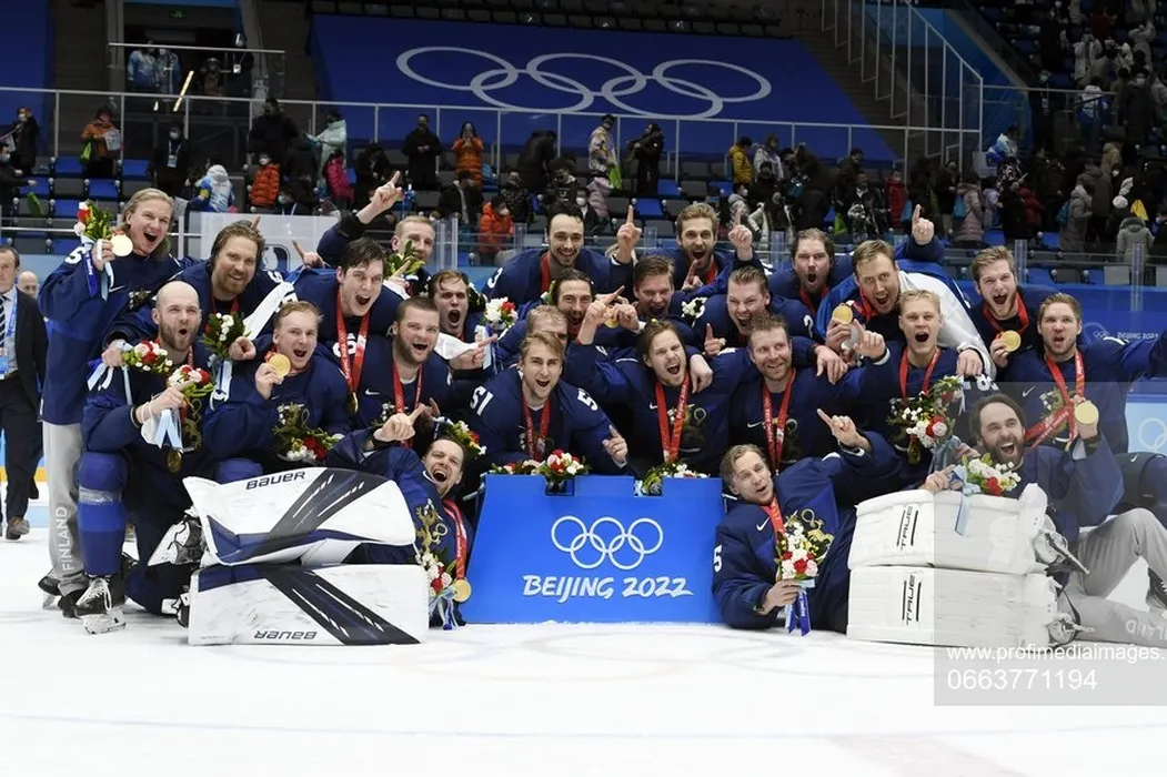 Captain Valtteri Filppula and Team Finland celebrate Olympic Gold medal after Men's Final Ice Hockey match Finland vs Russia's Olympic Committee ROC at the Beijing Winter Olympic Games in the Wukesong Sports Centre in Beijing on February 20, 2022.