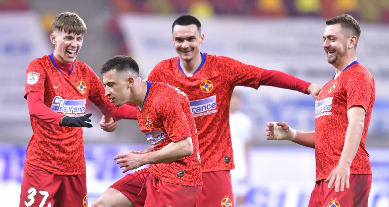 Fotbalistii stelisti Octavian George Popescu, Adrian Gheorghe Sut si Andrei George Miron se bucura dupa un gol marcat de catre Olimpiu Vasile Morutan in meciul de fotbal dintre FCSB si CFR Cluj, contand pentru Liga 1 Casa Pariurilor, desfasurat fara spectatori pe Arena Nationala din Bucuresti, vineri 19 martie 2021. © FOTO:Razvan Pasarica/SPORT PICTURES