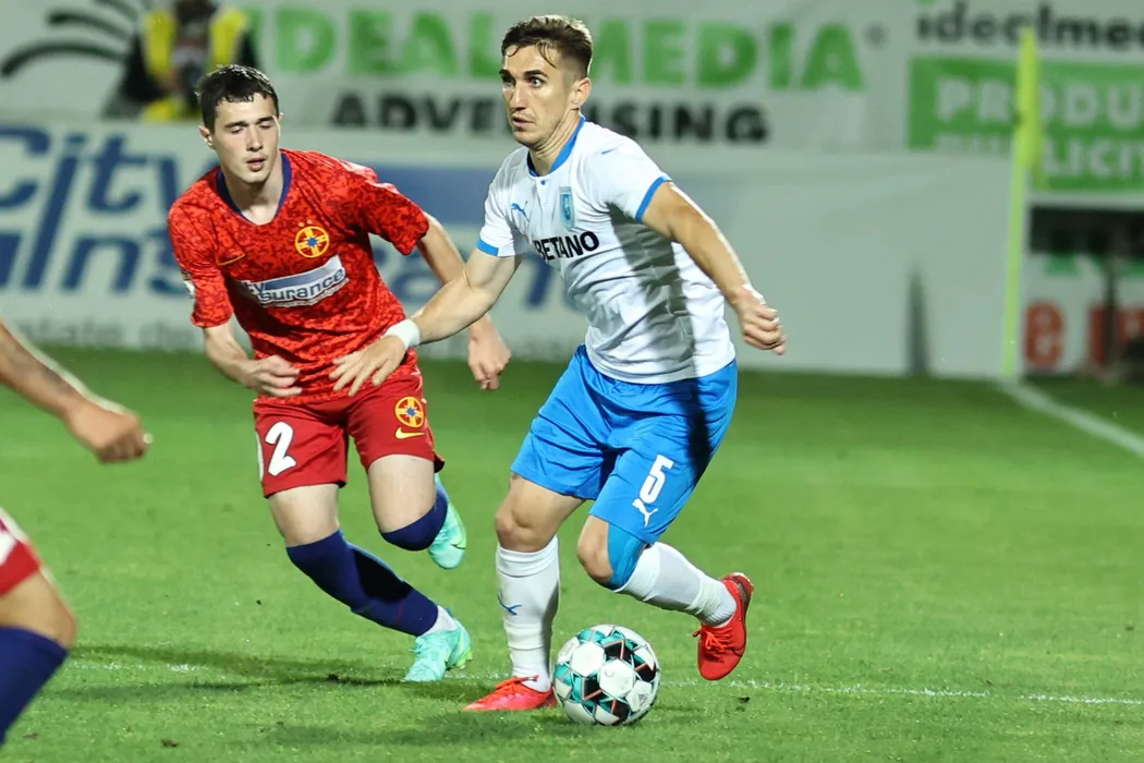 Adrian Nita (S), de la FCSB, lupta pentru balon cu Bogdan Vatajelu (D), de la Universitatea Craiova, in meciul de fotbal din etapa 9 a play-off-ului Ligii 1, disputat pe stadionul Marin Anastasovici din Giurgiu, miercuri, 19 mai 2021. GEORGE FILIP / MEDIAFAX FOTO