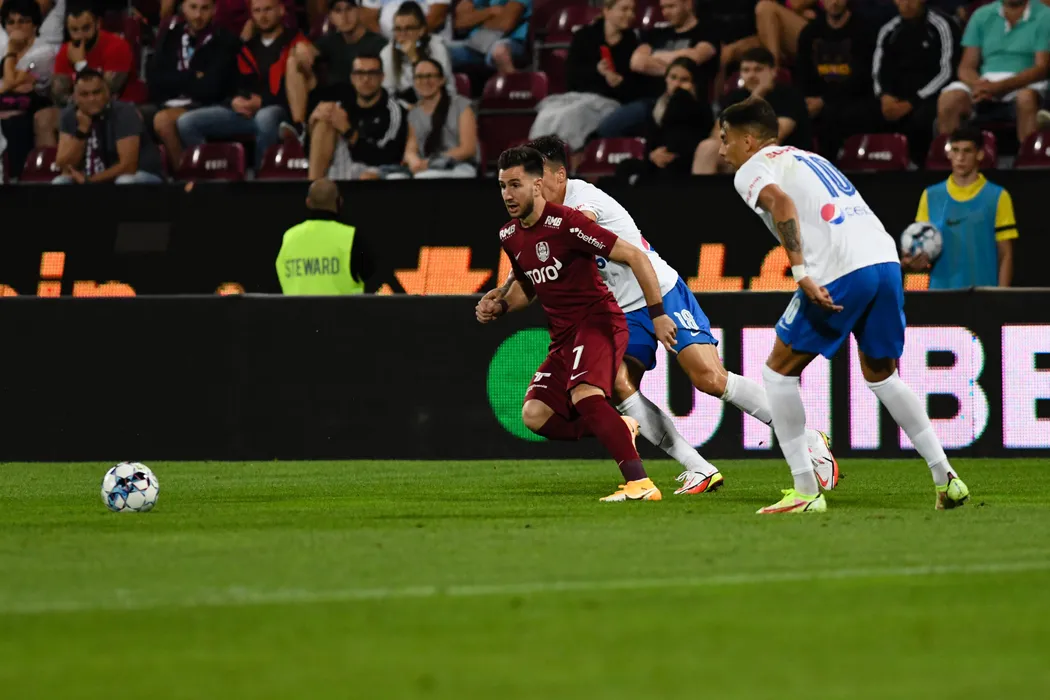 Andrei Paun (S), de la CFR Cluj, suteaza in timpul meciului de fotbal contra echipei FC Farul din etapa a IV-a a Ligii 1, disputat pe stadionul Dr. Constantin Radulescu, vineri, 13 august 2021. FLAVIU BUBOI / MEDIAFAX FOTO
