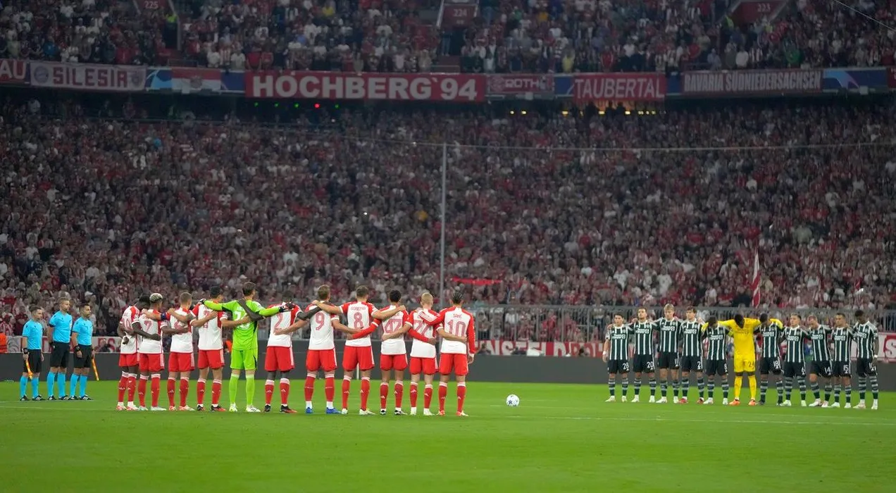 Squads observe a moment of silence for victims of Morocco earthquake and Libya floods before the Champions League group A soccer match between Bayern Munich and Manchester United at the Allianz Arena stadium in Munich, Germany, Wednesday, Sept. 20, 2023.,Image: 806899638, License: Rights-managed, Restrictions: This content is intended for editorial use only. For other uses, additional clearances may be required., Model Release: no